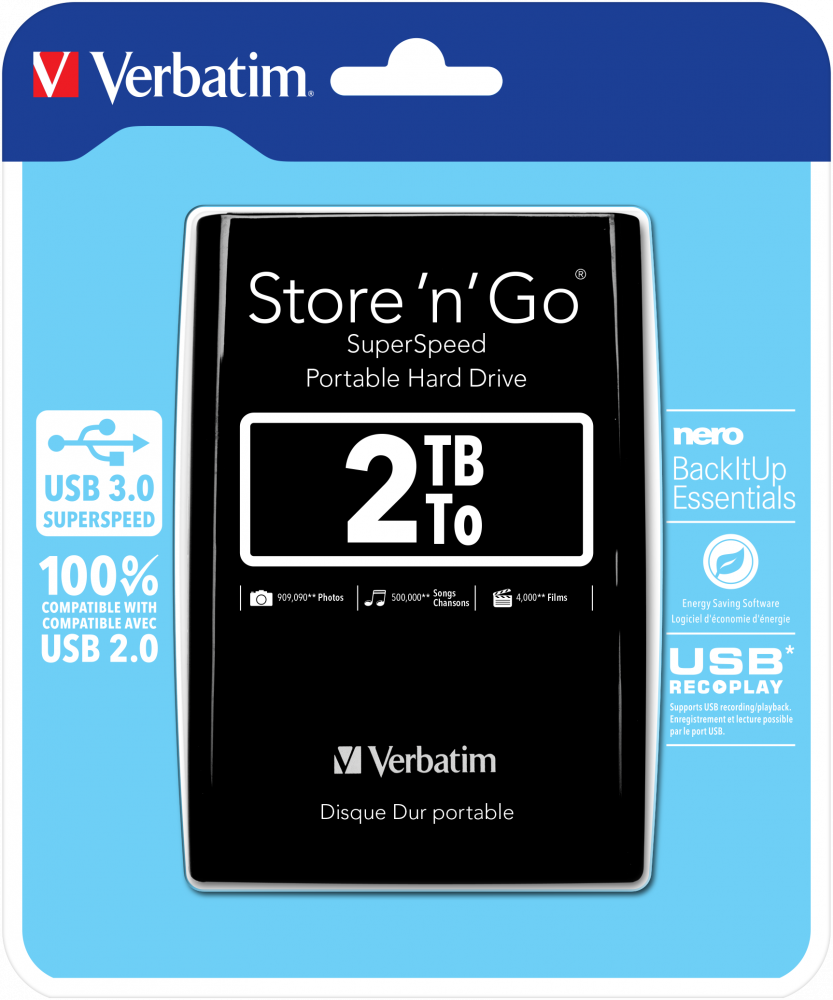 Verbatim externí HDD 2TB USB 3.0 Green Button Přenosný pevný disk Verbatim Store n Go nabízí velkokapacitní úložiště s rozhraním USB 3.0 Super Speed. Rozhraní USB 3.0 nabízí až desetkrát rychlejší přenos dat než USB 2.0 (podle rychlosti sběrnice USB), takže umožňuje extrémně rychlý přenos dat na cestách. Kapacita: 2TB Rozhraní: USB 3.0 Rozměry produktu: 116mm x 80mm x 13mm Hmotnost produktu: 150g Vysokorychlostní přenos dat díky rozhraní USB 3.0 Přenášejte snadno dokumenty a data mezi kanceláří a domovem. Bezpečně zálohujte a ukládejte všechny soubory z počítače či notebooku. Technologie USB plug ‘n’ play (nevyžaduje přídavný zdroj napájení) Stylový tenký design se snadno vejde na pracovní stůl a umožňuje snadné přenášení. Software Nero BackItUp Essentials – na pevném disku počítače nebo notebooku si můžete vytvořit zálohu na přenosný pevný disk. Příručka rychlého použití ve 27 jazycích stránky výrobce:https://www.verbatim-europe.cz/cz/prod/store-n-go-usb-3-0-portable-hard-drive-2tb-black-53177/