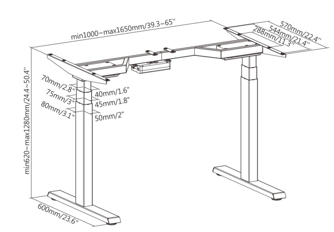 Výškově stavitelná stolová podnož Brateck M08-23DE 2 motory rozsah 620-1280 mm nosnost 100 kg